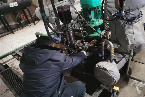 熱力公司工作人員維修熱力站補水泵止回閥